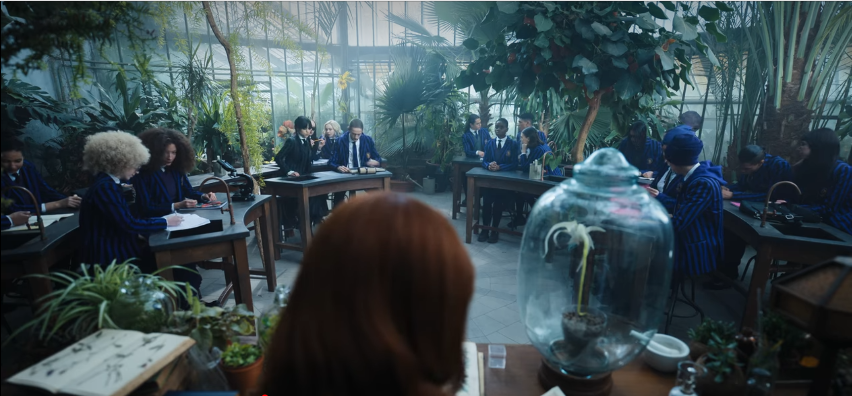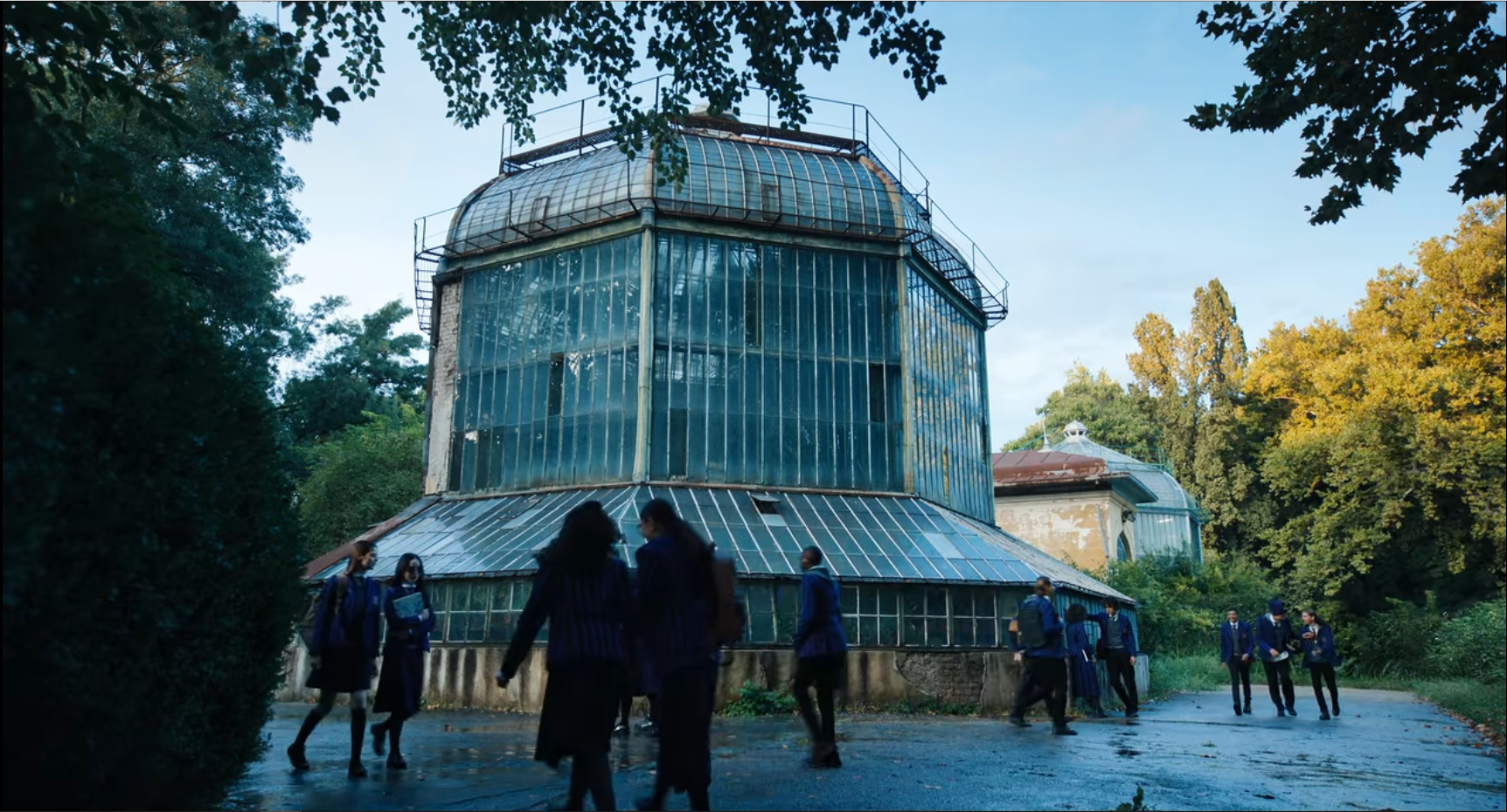 The very first scene of the show shows us Wednesday’s high school, likely located somewhere in the state of New Jersey. The exterior is a building at the Politehnica University of Bucharest.